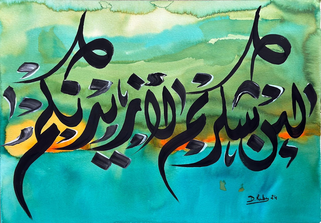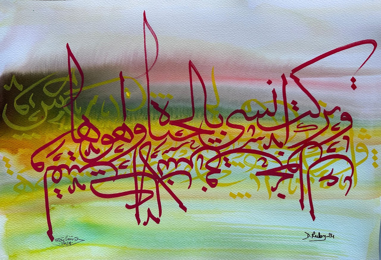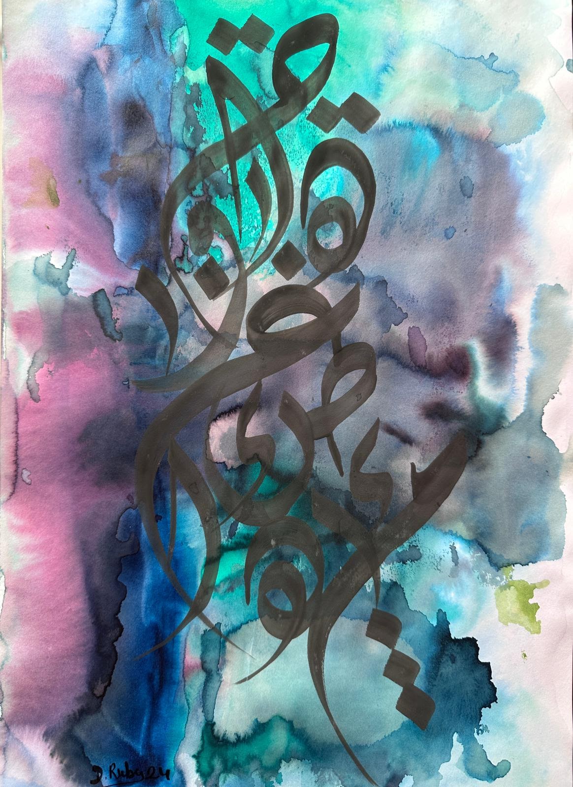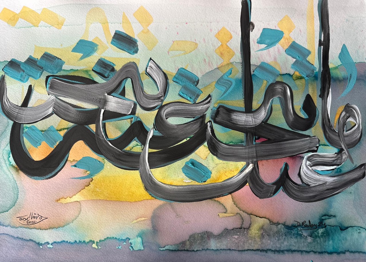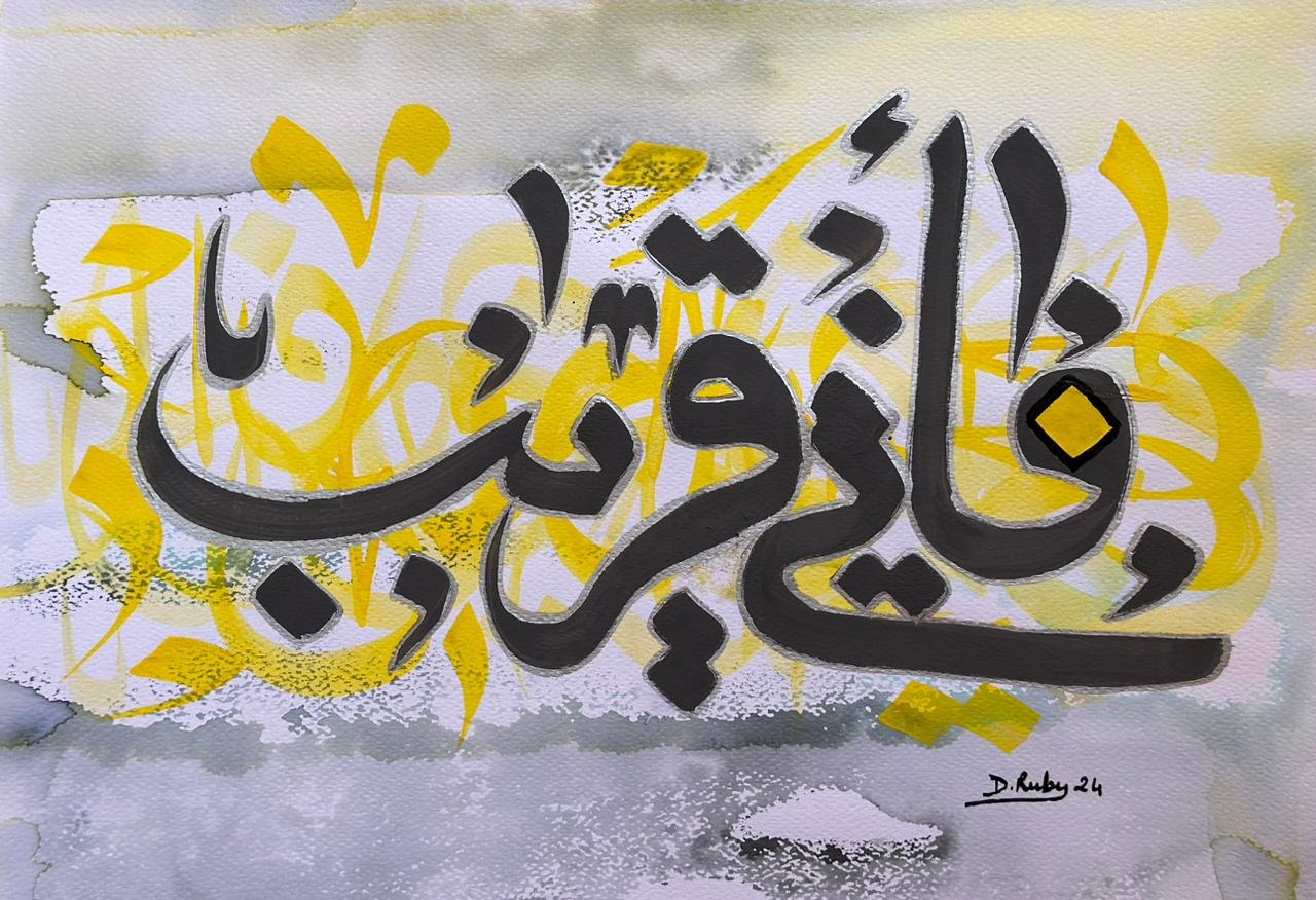 “Arabic calligraphy is more than an art form; it’s a language that speaks to the soul. In my calligraphy works, I use traditional scripts and holy verses infused with modern expression to convey the essence of precious stones, virtues, and spirituality. Each line and curve is a journey into the beauty and rhythm of the written word, merging my cultural heritage with contemporary aesthetics.”