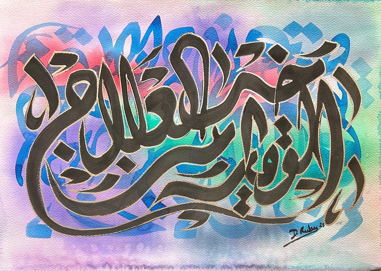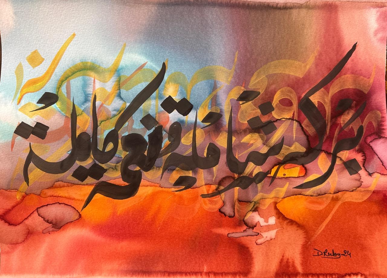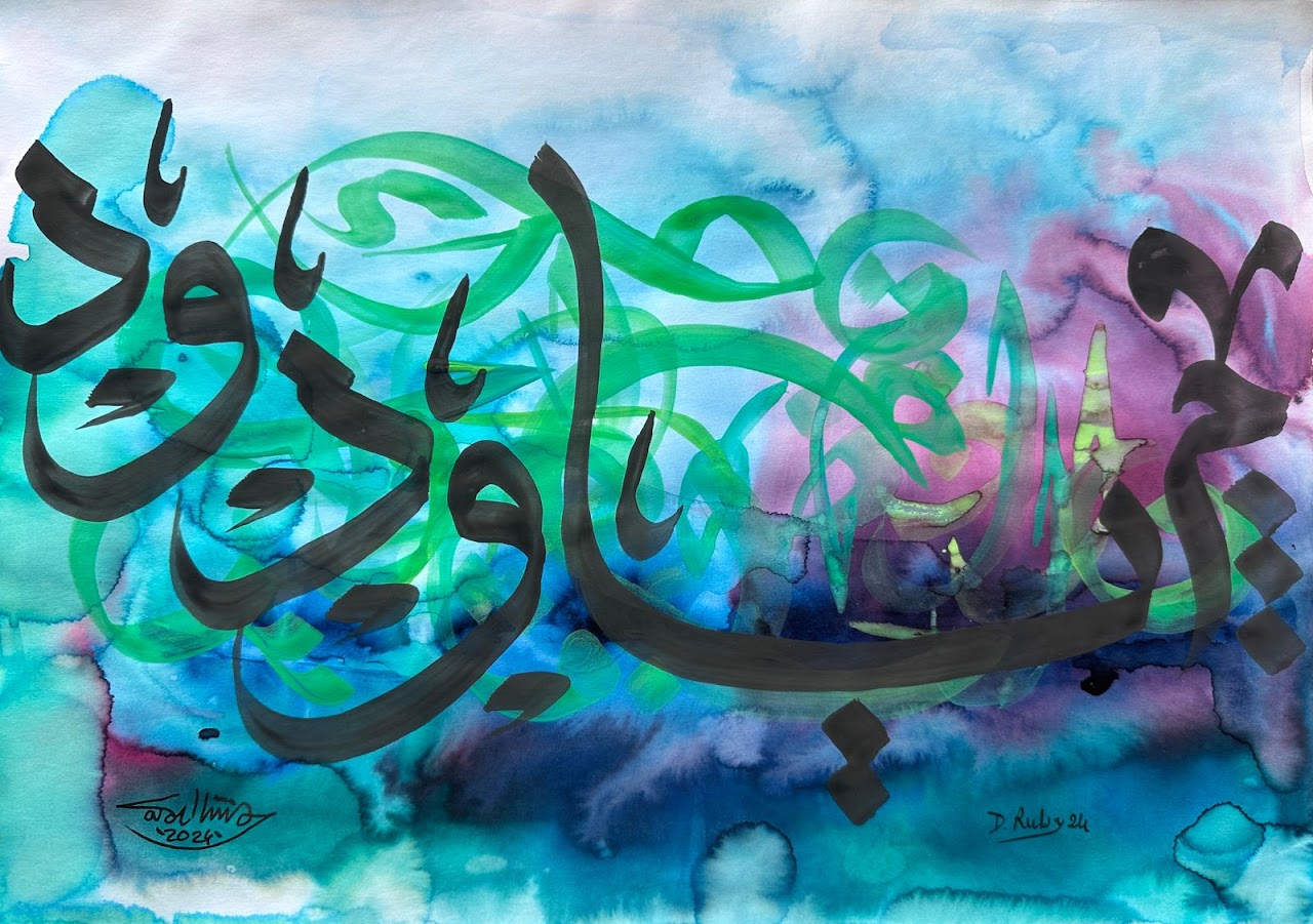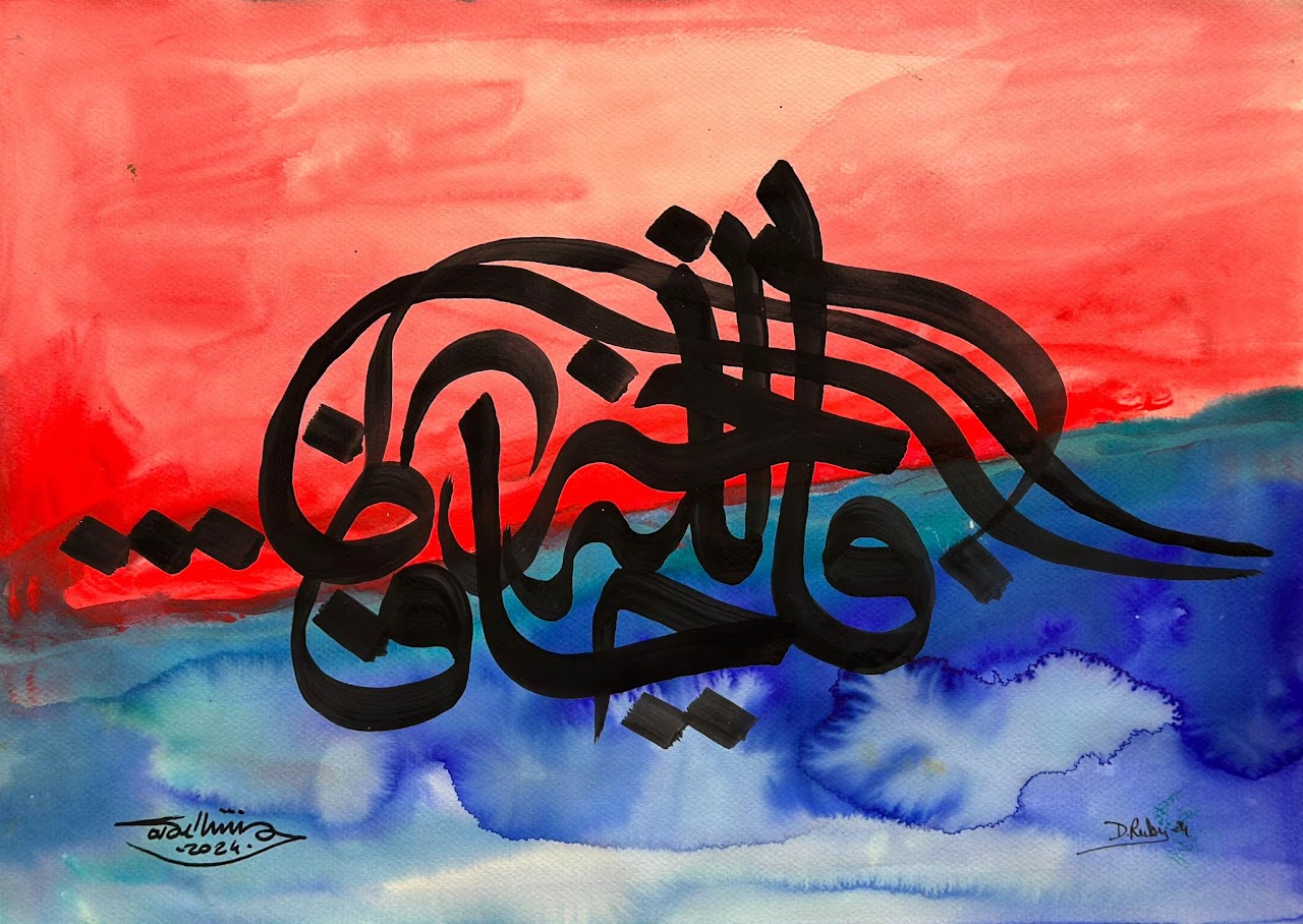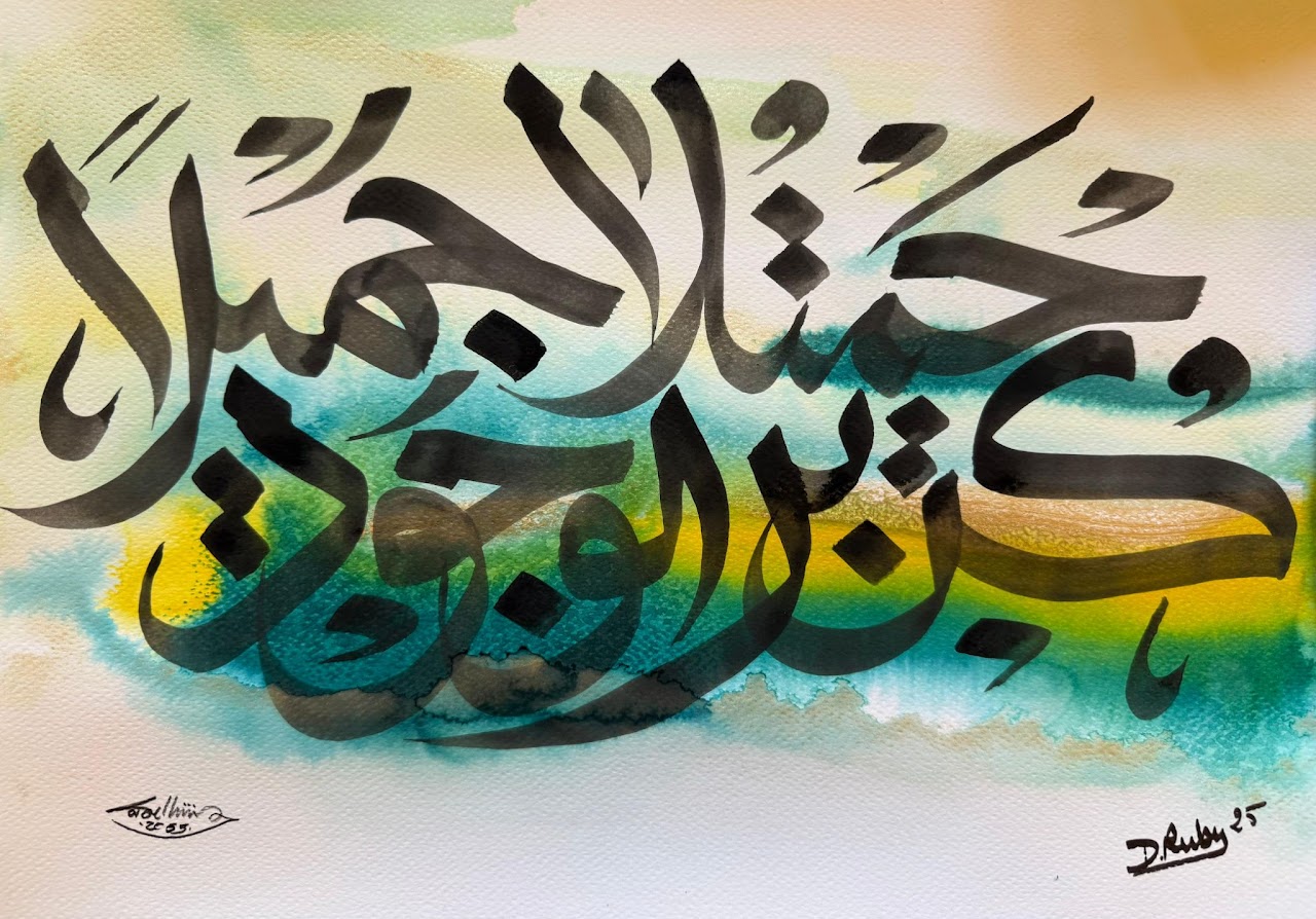 “Arabic calligraphy is more than an art form; it’s a language that speaks to the soul. In my calligraphy works, I use traditional scripts and holy verses infused with modern expression to convey the essence of precious stones, virtues, and spirituality. Each line and curve is a journey into the beauty and rhythm of the written word, merging my cultural heritage with contemporary aesthetics.”