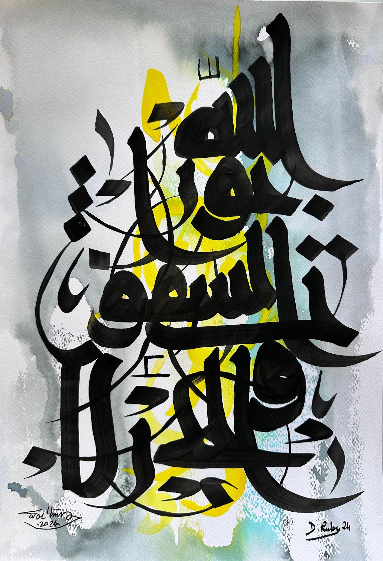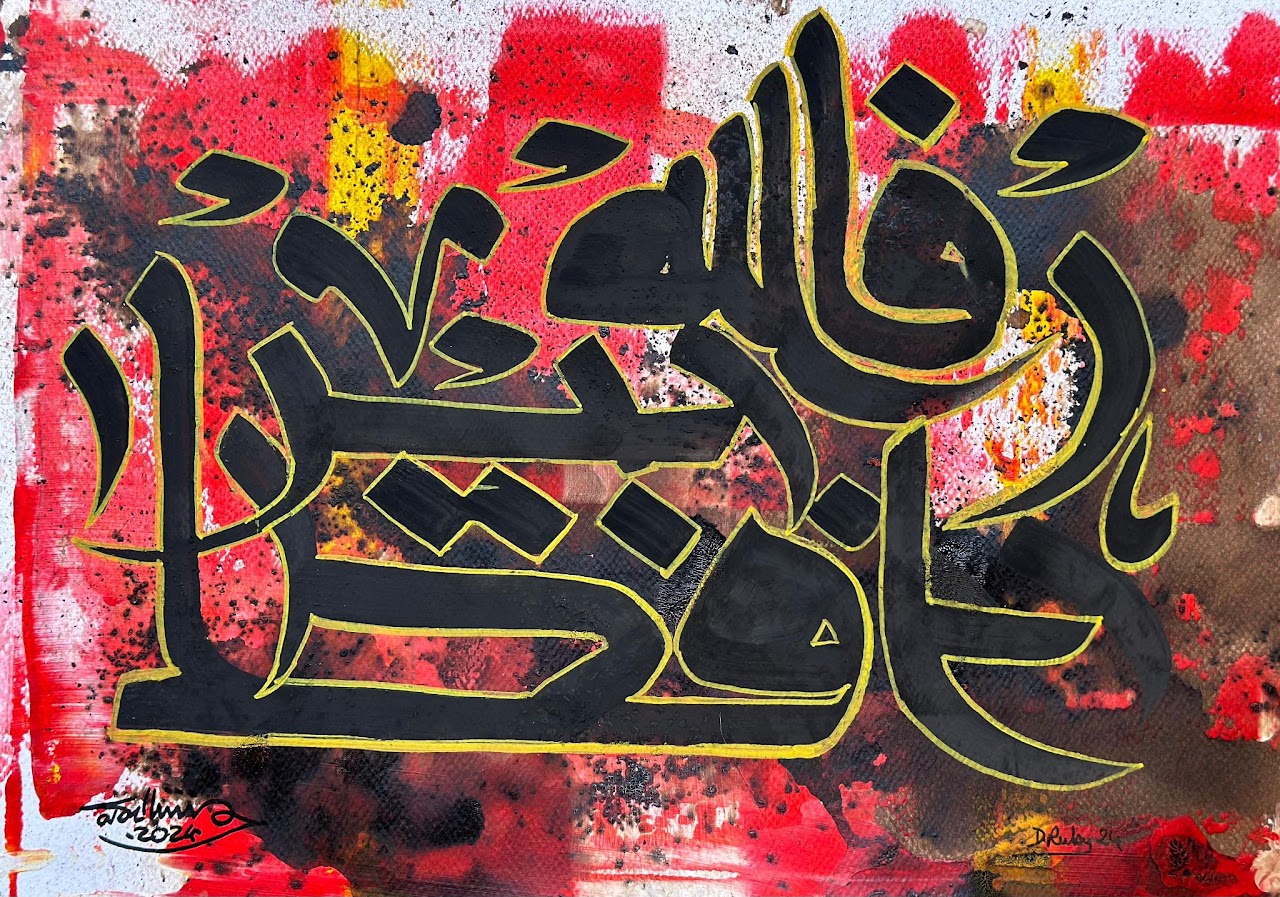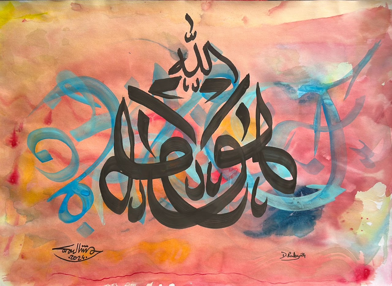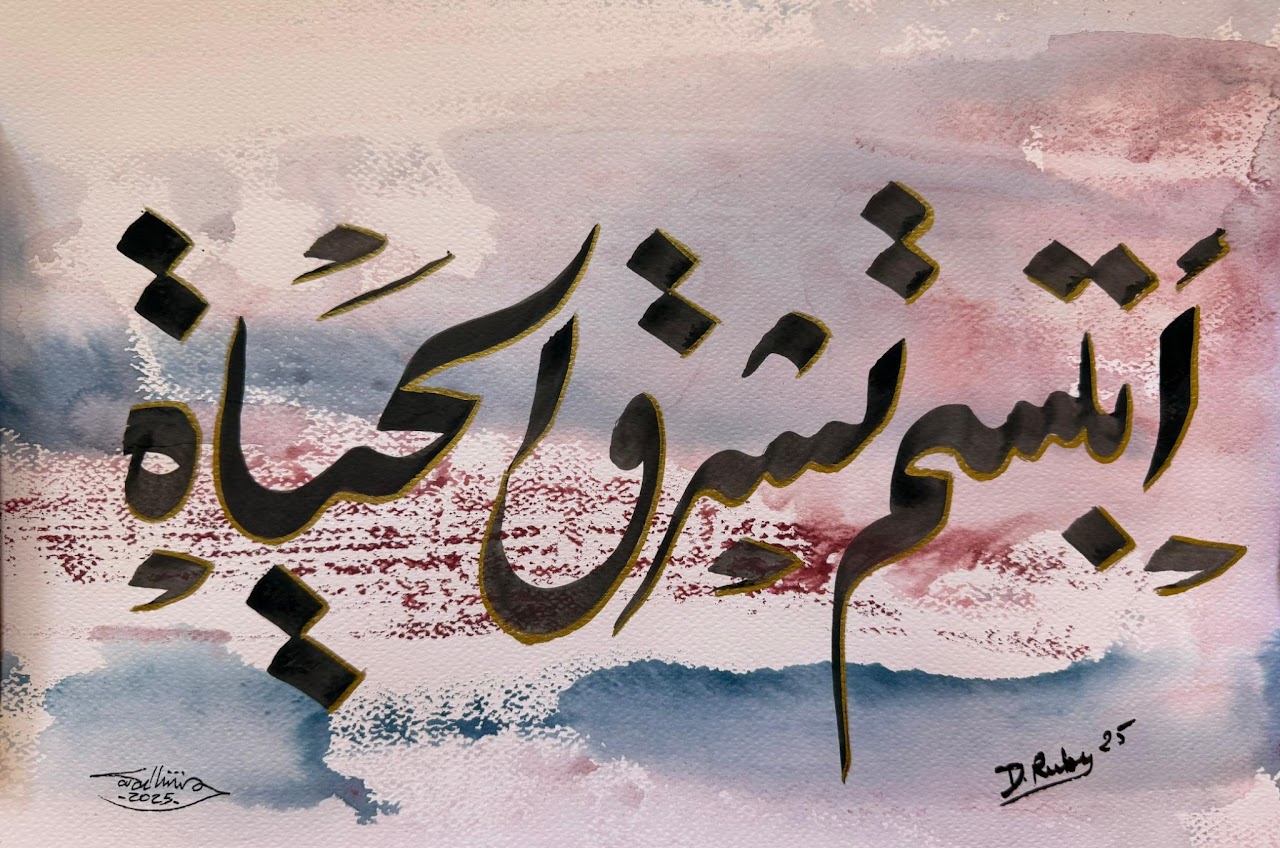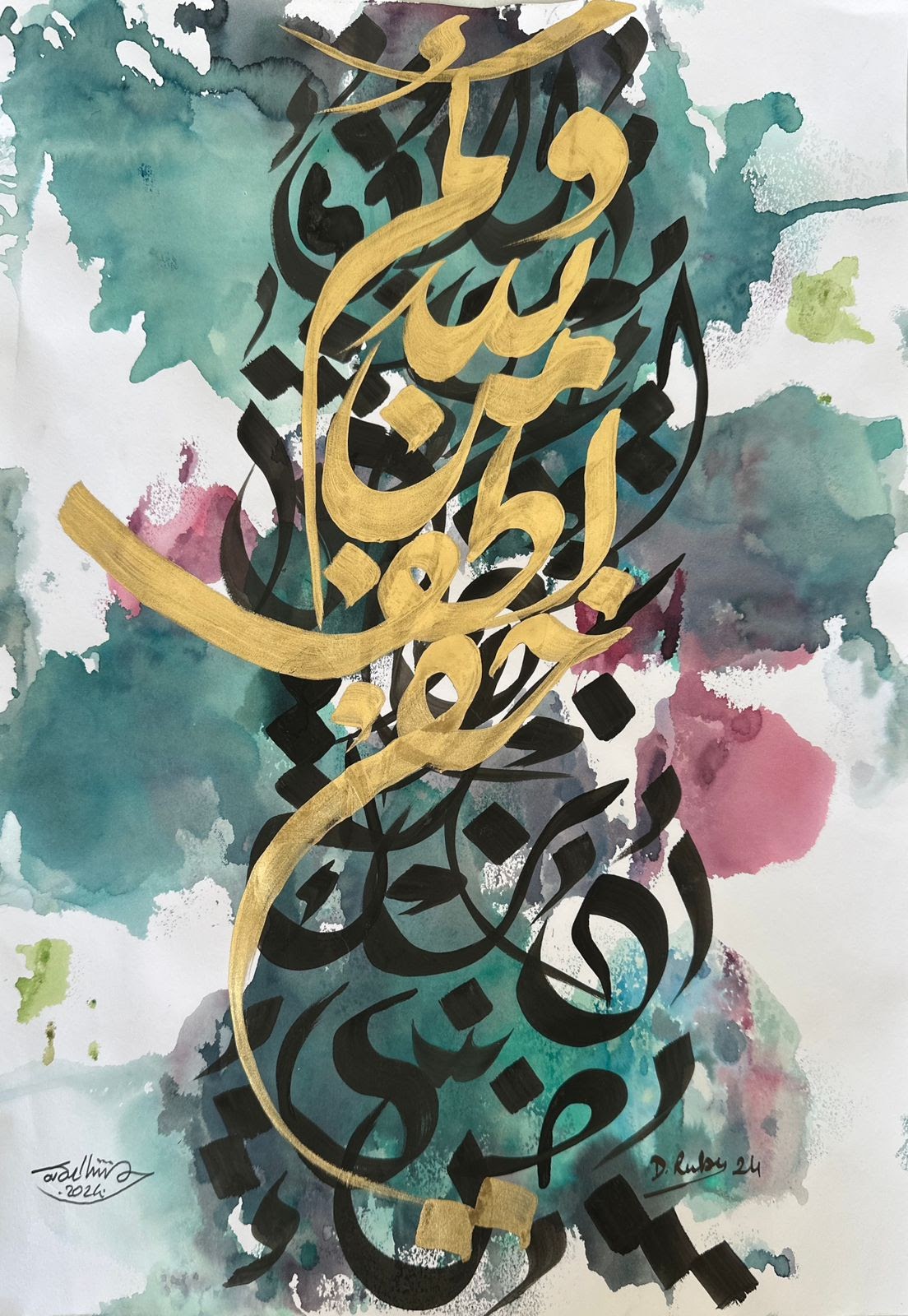 “Arabic calligraphy is more than an art form; it’s a language that speaks to the soul. In my calligraphy works, I use traditional scripts and holy verses infused with modern expression to convey the essence of precious stones, virtues, and spirituality. Each line and curve is a journey into the beauty and rhythm of the written word, merging my cultural heritage with contemporary aesthetics.”
