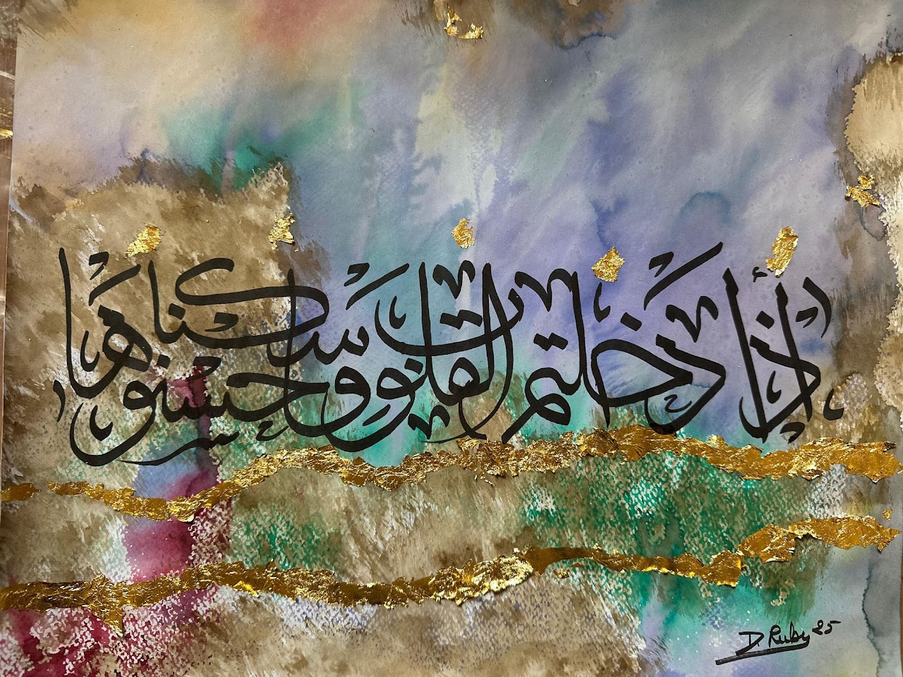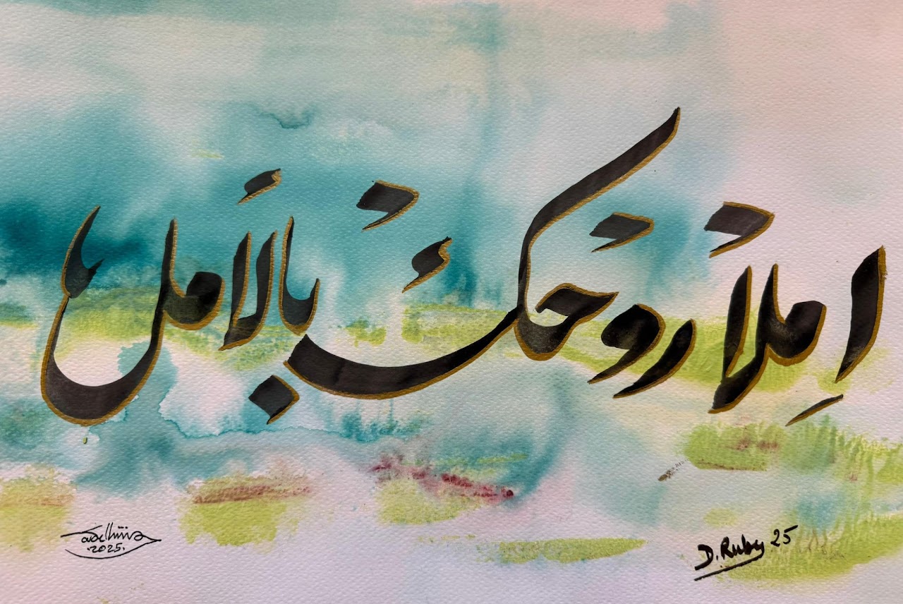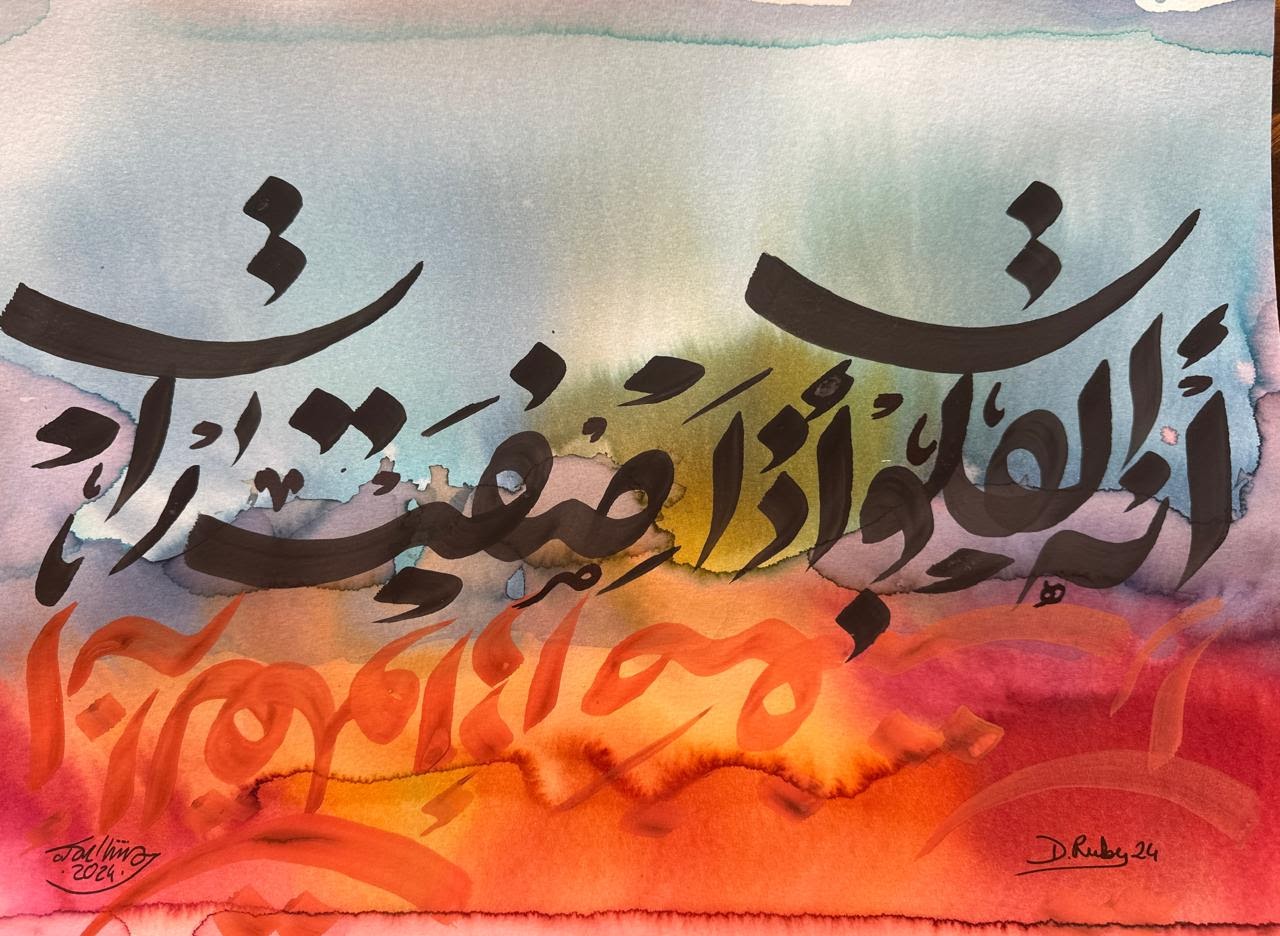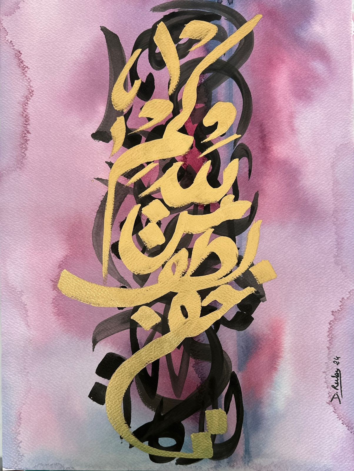 “Arabic calligraphy is more than an art form; it’s a language that speaks to the soul. In my calligraphy works, I use traditional scripts and holy verses infused with modern expression to convey the essence of precious stones, virtues, and spirituality. Each line and curve is a journey into the beauty and rhythm of the written word, merging my cultural heritage with contemporary aesthetics.”