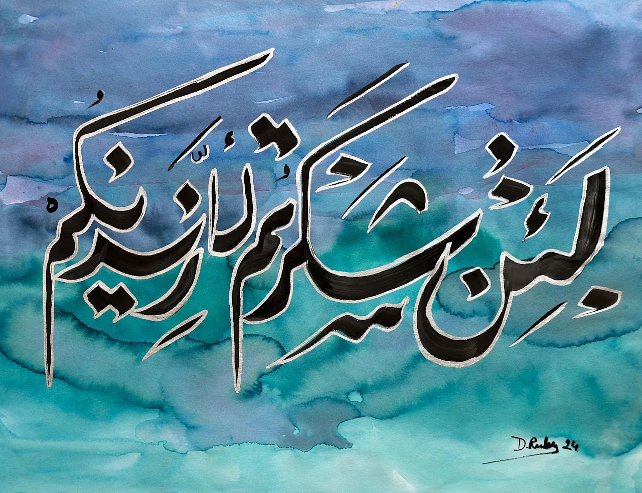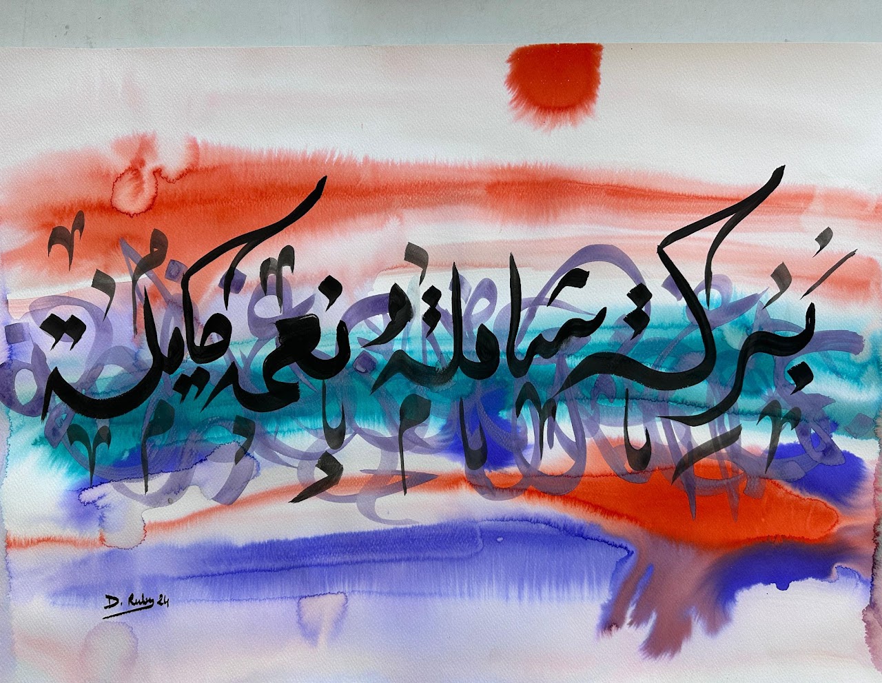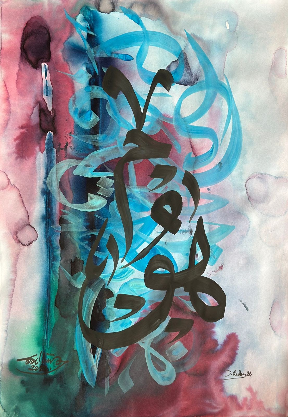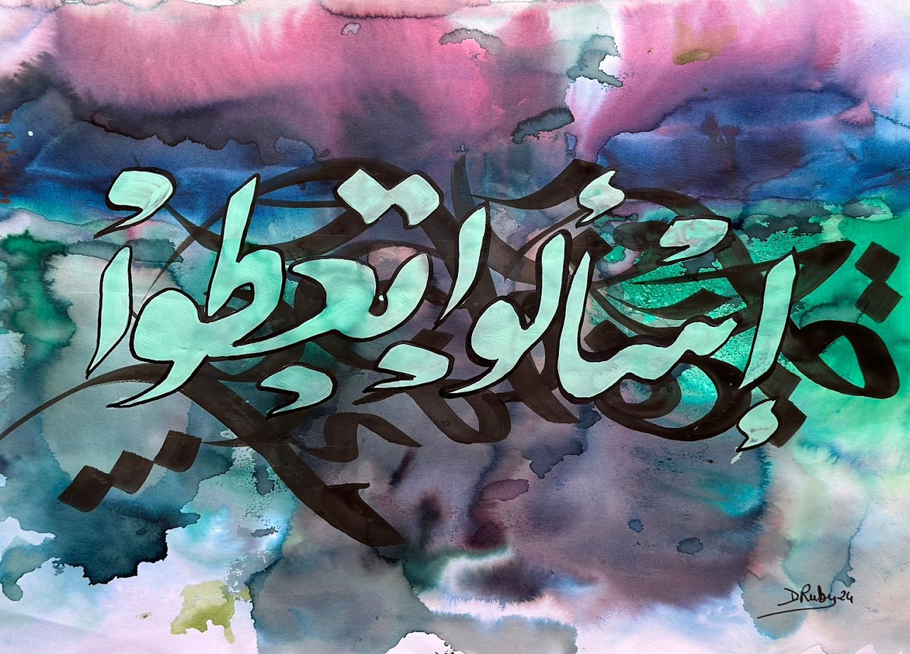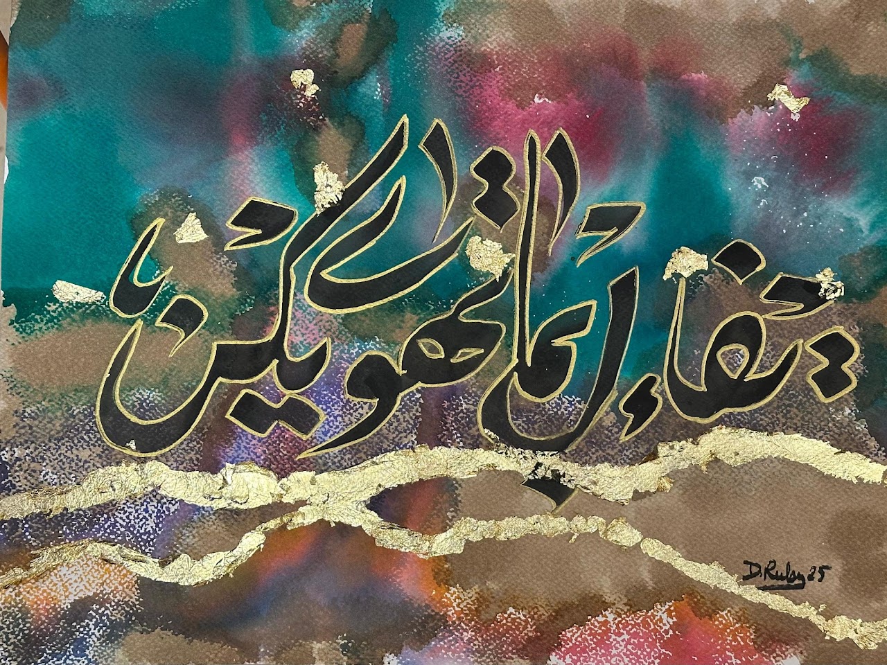 “Arabic calligraphy is more than an art form; it’s a language that speaks to the soul. In my calligraphy works, I use traditional scripts and holy verses infused with modern expression to convey the essence of precious stones, virtues, and spirituality. Each line and curve is a journey into the beauty and rhythm of the written word, merging my cultural heritage with contemporary aesthetics.”